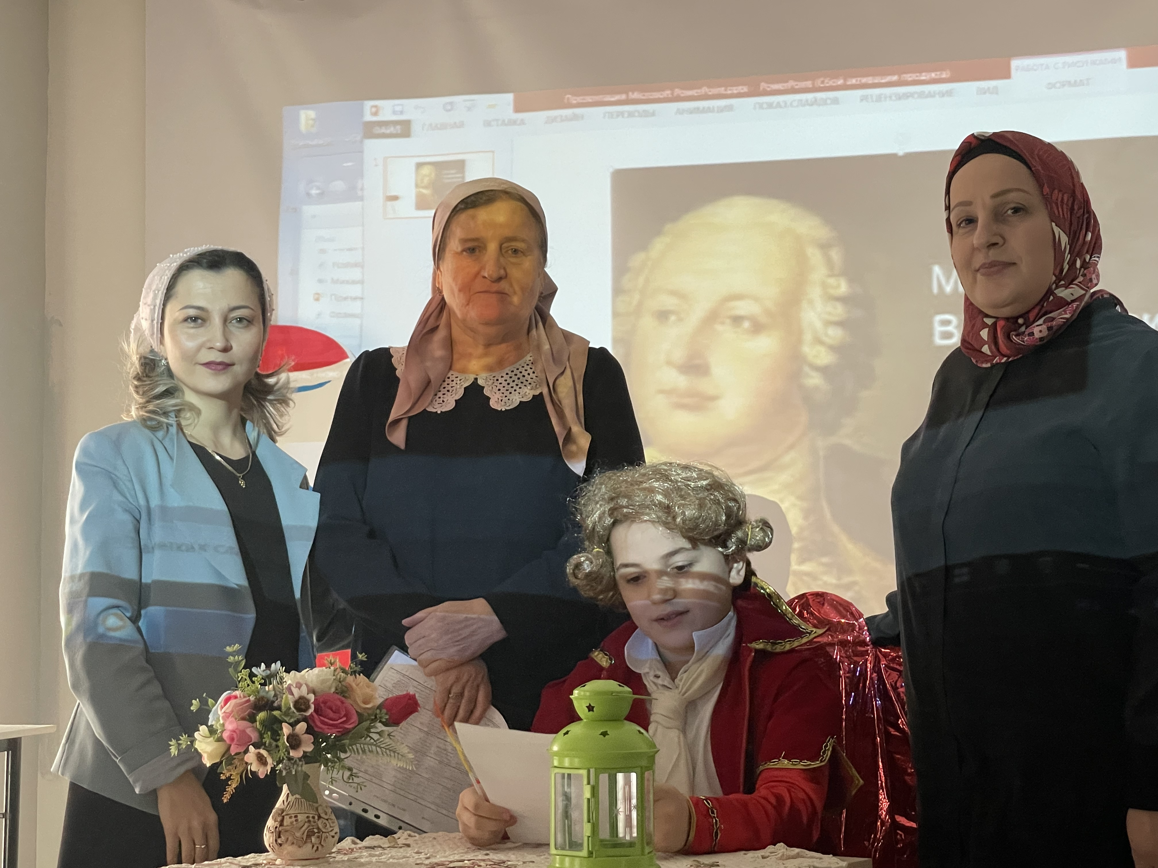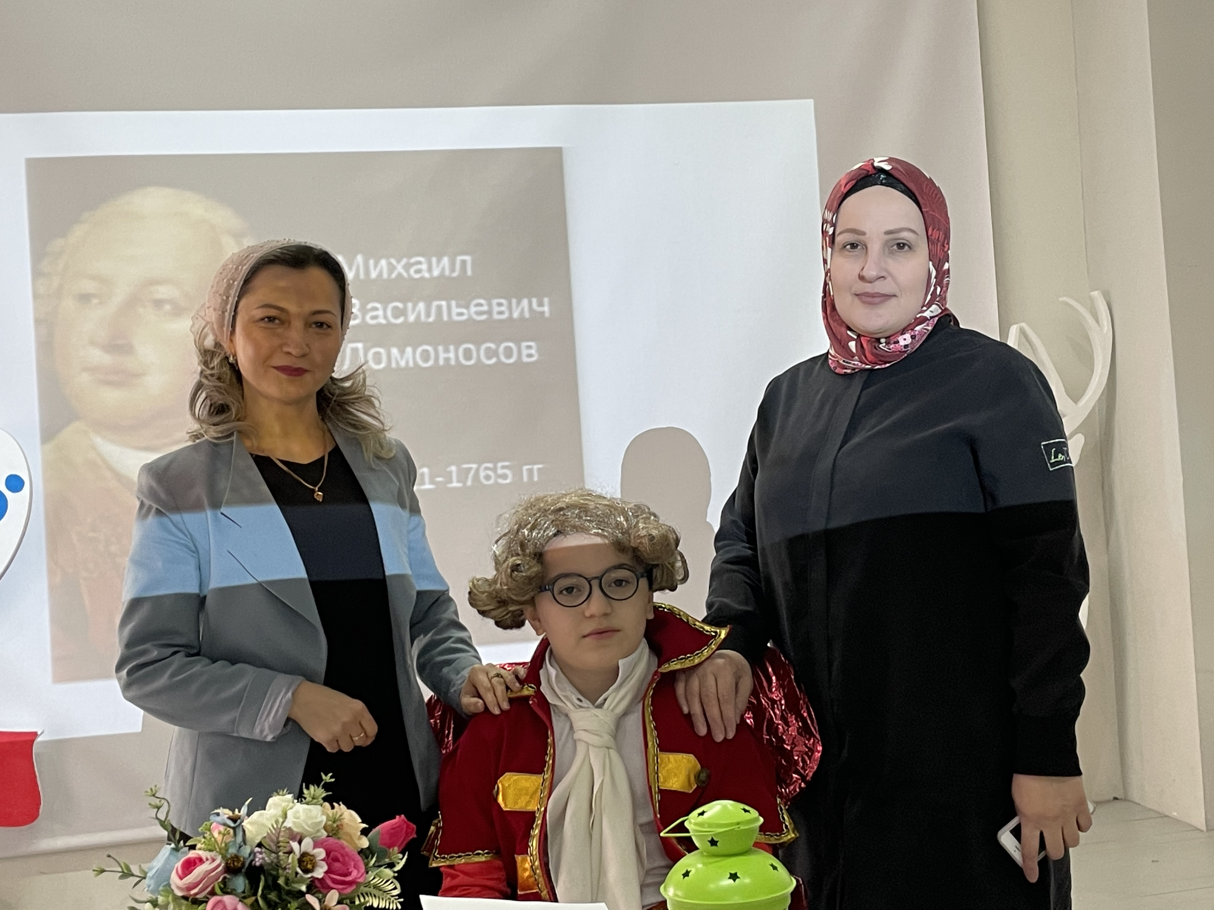Учителя русского языка и литературы Гамаргаева Э.М., Базгиева Д.А., Даудова М.З. совместно с учениками гимназии окунули нас в эпоху 18 века, представив вниманию зрителей мини-спектакль «Ты наш друг и наш Учитель, славный М.В. Ломоносов». В роли юного М.В. Ломоносова выступал ученик 5 А класса Берсанов Сурхо. Наши славные ведущие Туркаев Дени и Докуев Ильяс познакомили зрителей с биографией М.В. Ломоносова. Ребята постарались донести до своих товарищей атмосферу дружелюбия, верности, чести и порядочности. Учащиеся 9 А и 7 А классов Демильханов Бекхан и Истамулова Халима порадовали слушателей стихами М.В. Ломоносова. Выступление получило живой отклик у сидевших в зале выпускников: они ведь в этом году уходят из школы. Прозвучала идея преемственности поколений. «Овладейте же литературным языком. Боритесь за культуру речи»- с таким своеобразным призывом завершили свое интереснейшее выступление ведущие мероприятия.