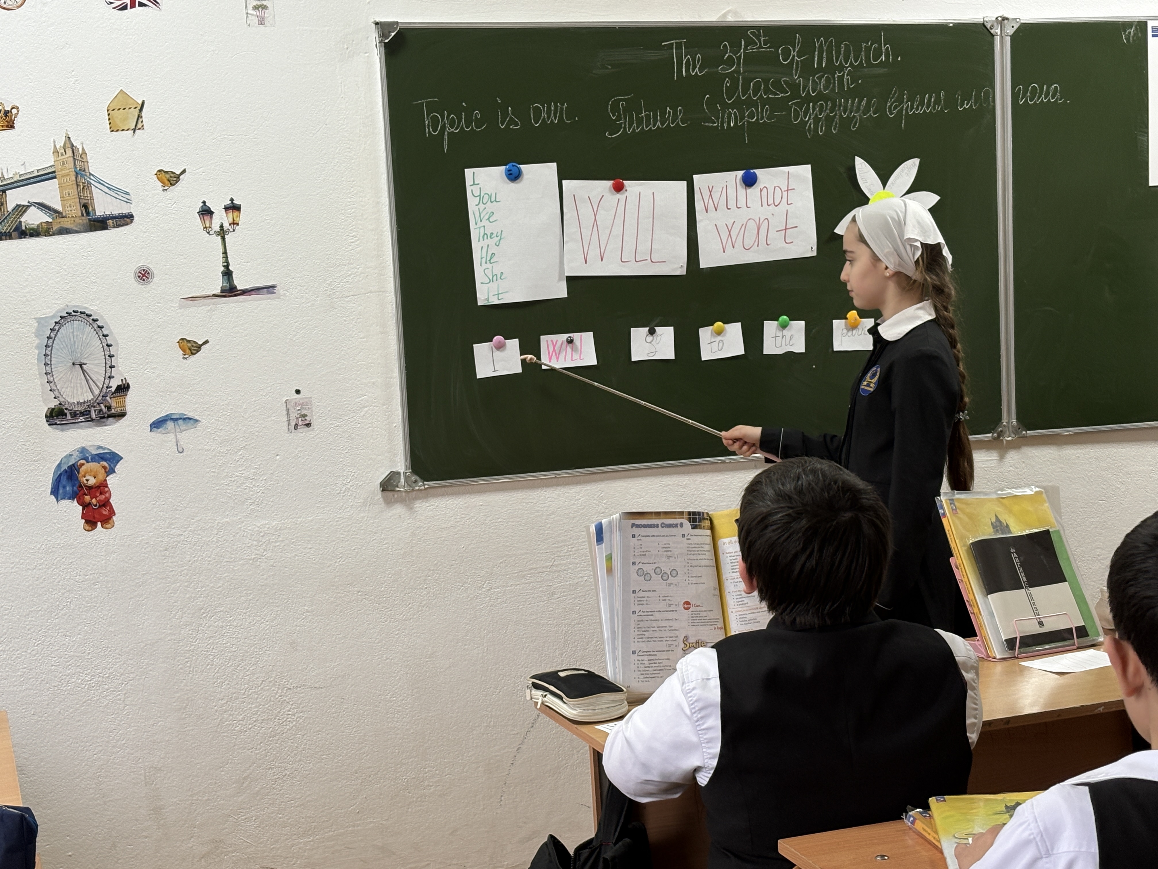 31.03.2026Сегодня на уроке английского языка ученики 5 "Б" класса начали наше путешествие в мир будущего. мы узнали как строить предложения в будущем времени используя глагол WILL. Ребята активно составляли свои предложения о будущем времени. Отвечали на вопросы учителя показывая свои карточки с утверждениями "будут" и "не будут" они это делать